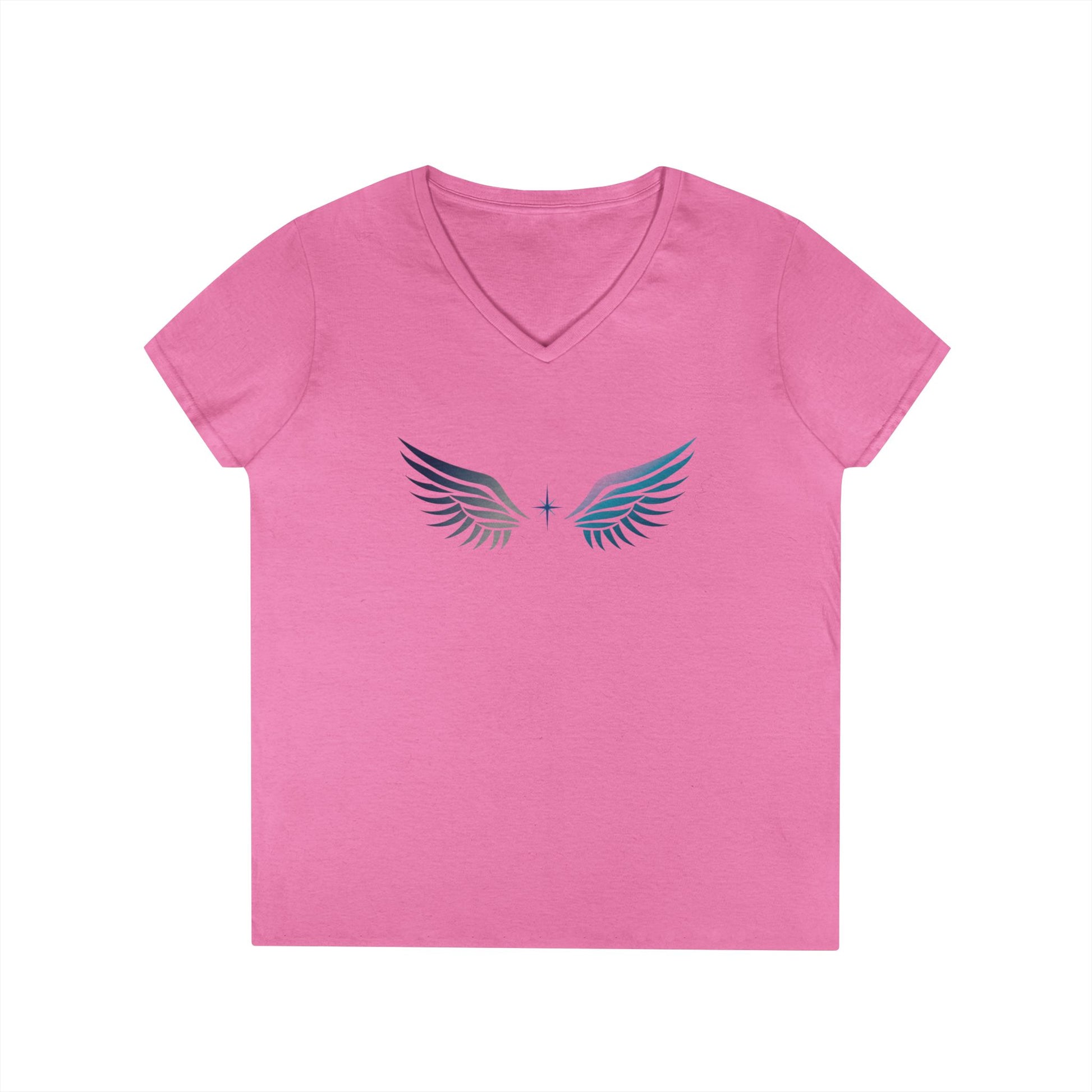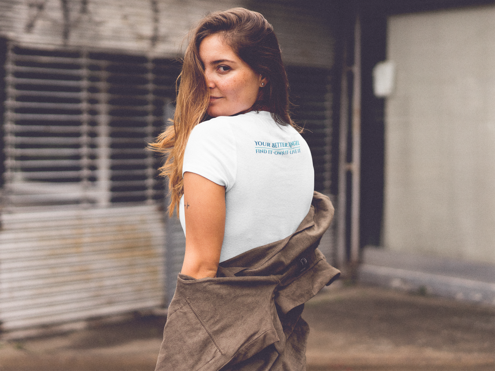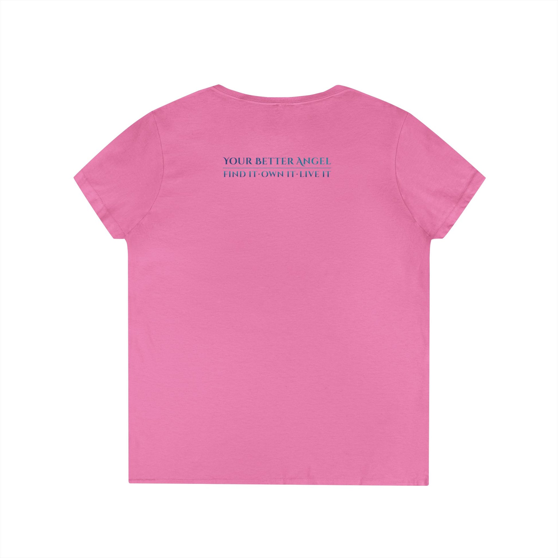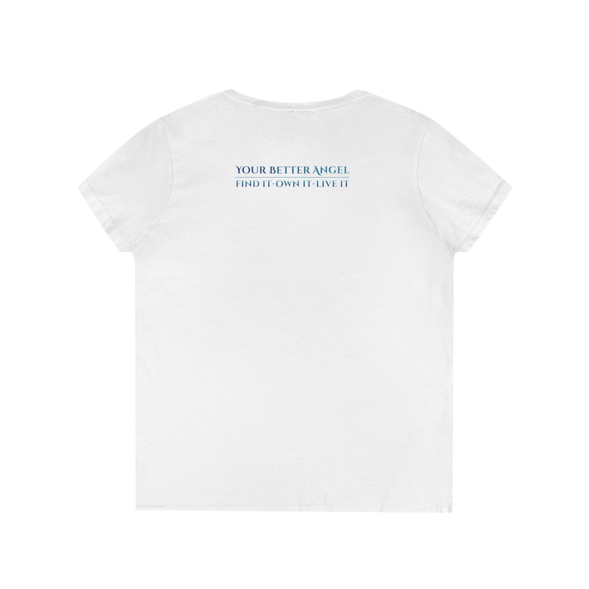 Define your style with intention. This women's V-neck tee beautifully showcases the Your Better Angel wing design on the front, symbolizing freedom and personal growth. The back features our empowering brand name and tagline, "Find It. Own It. Live It," serving as a daily affirmation. Designed for comfort and a flattering fit, it’s a versatile statement piece that encourages you to embrace your authentic self and let your inner "Better Angel" shine, whether dressed up or down.